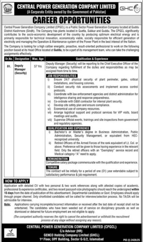 Only Male candidates can apply for this Central Power Generation Company Limited (CPGCL) Jobs October 2025 Qualification /Experience Required: Bachelor’s or Master’s degree in Business Administration, Public Administration, Security Management, or equivalent from HEC- recognized university. Retired Officers of the Armed Forces of the rank equivalent of Lt. Col. or above. Preference will be given to those having experience in the relevant field. Only the retired officers with an “Exemplary service record and Medical category-“A” need to apply. and more experienced candidates should apply before 06 October 2025.
