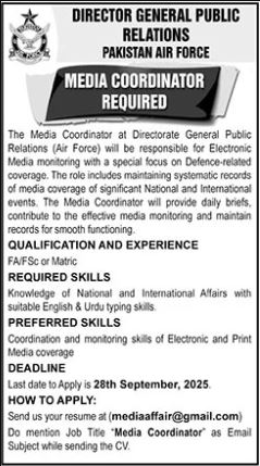 Candidates if you are seeking the Director General Public Relations Air Force Jobs October 2025 if yes. It would be best if you tried to complete read this Director General Public Relations job because you can easily apply for these vacancies Media Coordinator. Only Male candidates can apply for this Director General Public Relations Air Force Jobs October 2025 Qualification /Experience Required: FA/FSC or Matric Knowledge of National and International Affairs with suitable English & Urdu typing skills. Coordination and monitoring skills of Electronic and Print Media coverage The Media Coordinator at Directorate General Public Relations (Air Force) will be responsible for Electronic Media monitoring with a special focus on Defence-related coverage. The role includes maintaining systematic records of media coverage of significant National and International events. The Media Coordinator will provide daily briefs, contribute to the effective media monitoring and maintain records for smooth functioning. and more experienced candidates should apply before 28 September 2025.