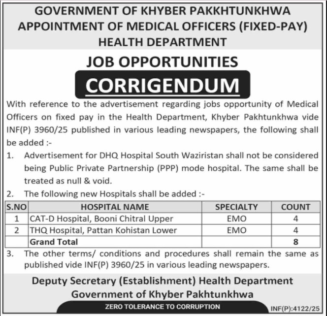 Only male candidates can apply for. Medical Officers and Health Department Jobs In October 2025 Qualification /Experience Required: Advertisement for DHQ Hospital South Waziristan, shall not be considered as a Private Partnership (PPP) mode hospital. The same shall be treated as null & void, and more experienced candidates should apply before 06 October 2025.