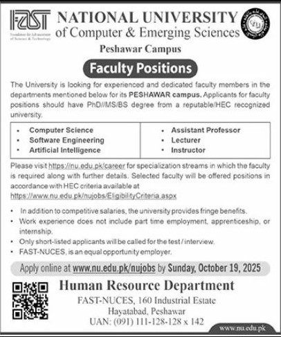 Only male candidates can apply for National University Of Computer Sciences Jobs In Peshawar, October 2025 Qualification /Experience Required: The University is looking for experienced and dedicated faculty members in the departments mentioned below for its PESHAWAR campus. Applicants for faculty positions should have PhD//MS/BS degree from a reputable/HEC-recognized university, and more experienced candidates should apply before 19 October 2025.
